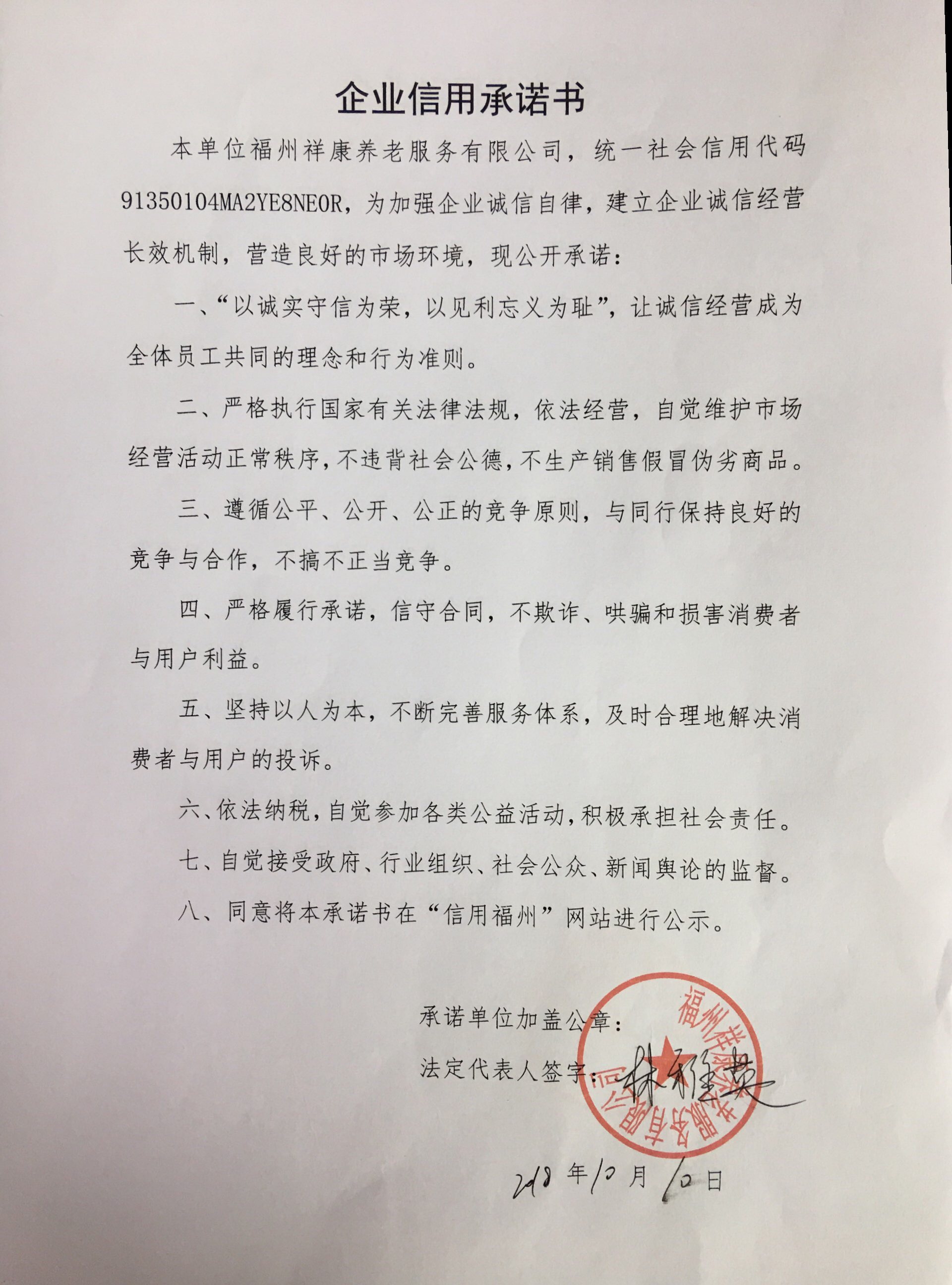 仓山区:福州祥康养老服务有限公司承诺书