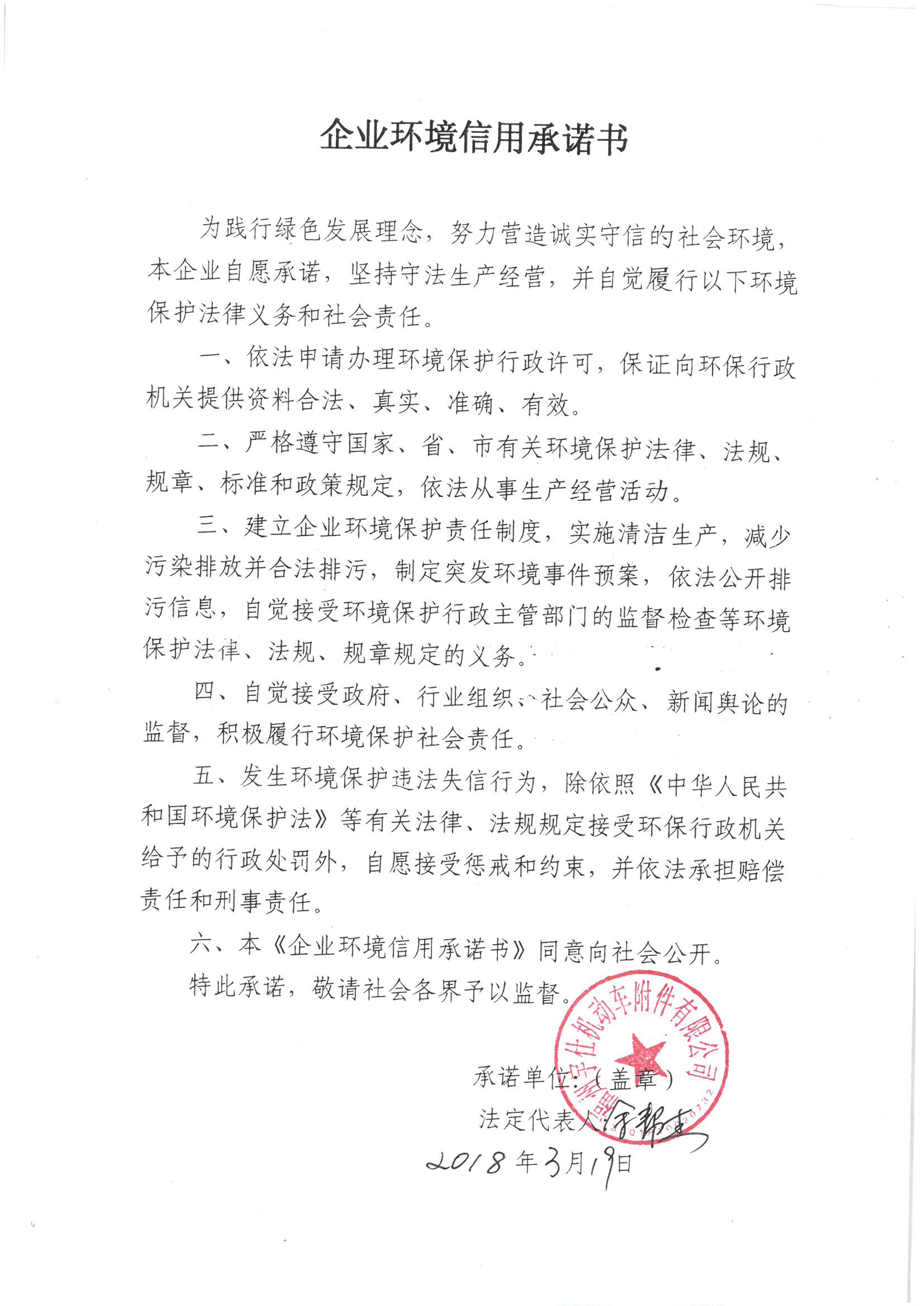 福州宇仕机动车附件有限公司企业环境信用承诺书