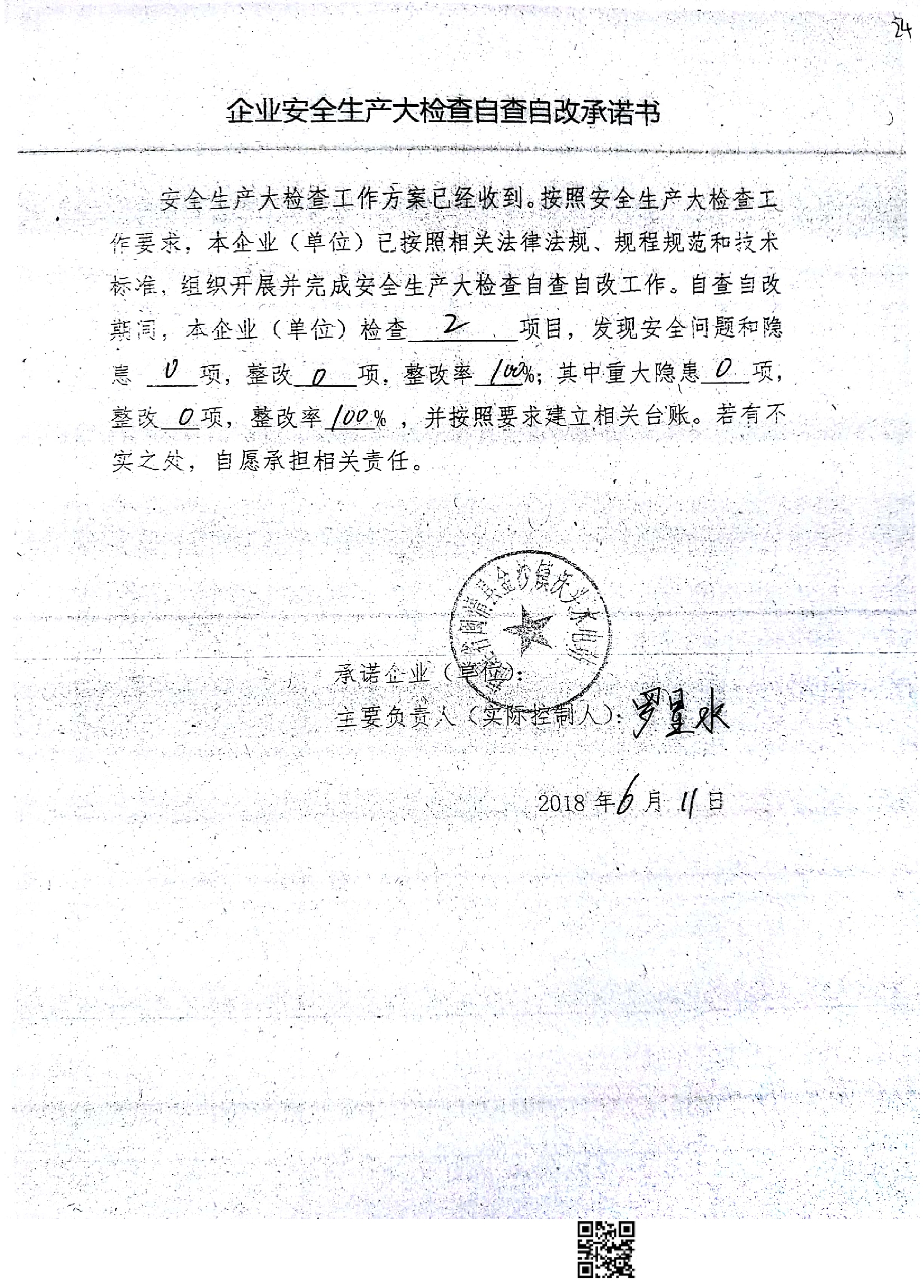 福建省闽清县金沙镇沃头水电站签署《企业安全生产大检查自查自改承诺书》