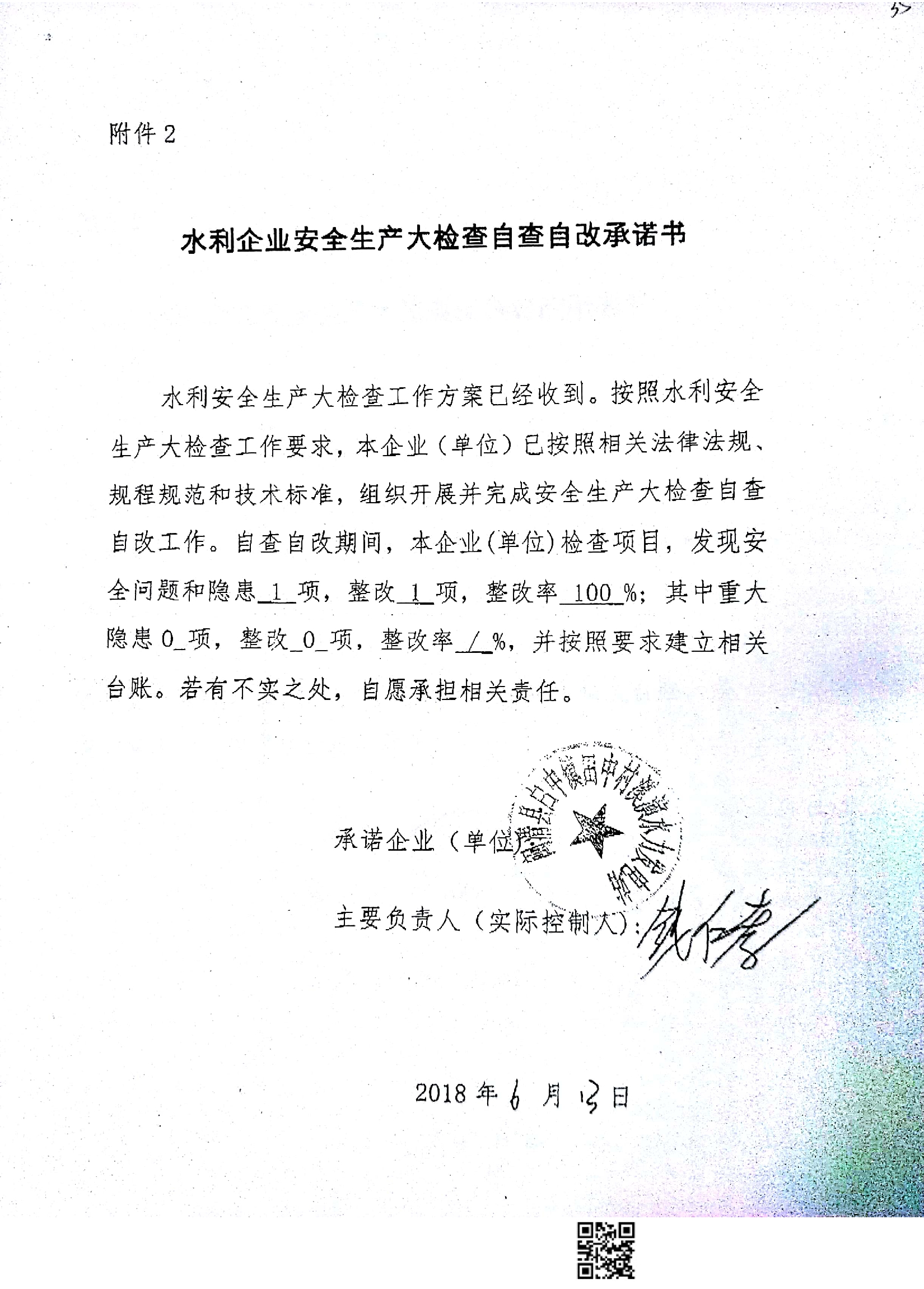 闽清县白中镇田中村溪演水利发电站签署《水利企业安全生产大检查自查自改承诺书》