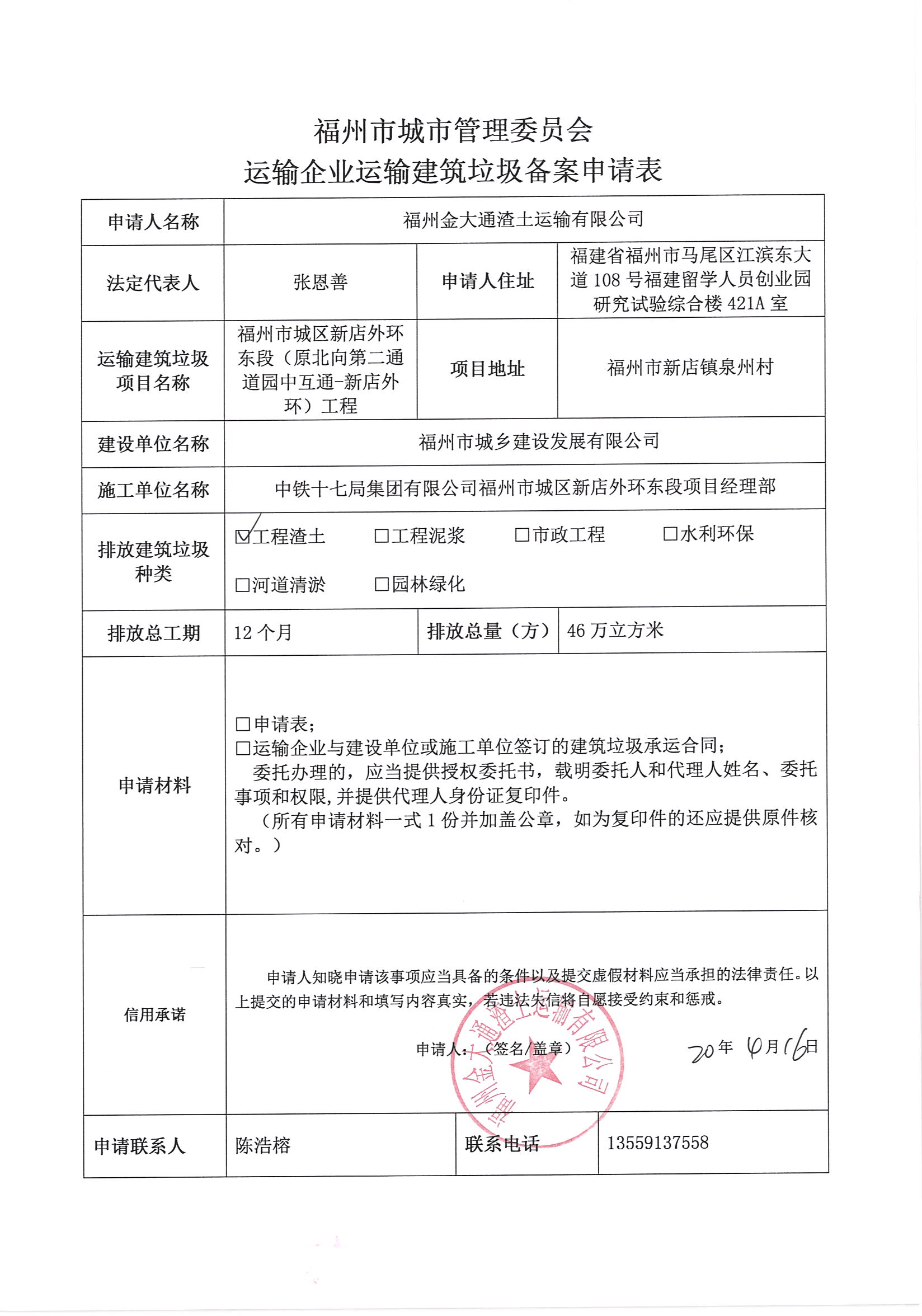 福州金大通渣土运输有限公司申请运输企业运输建筑垃圾备案第1179号信用承诺