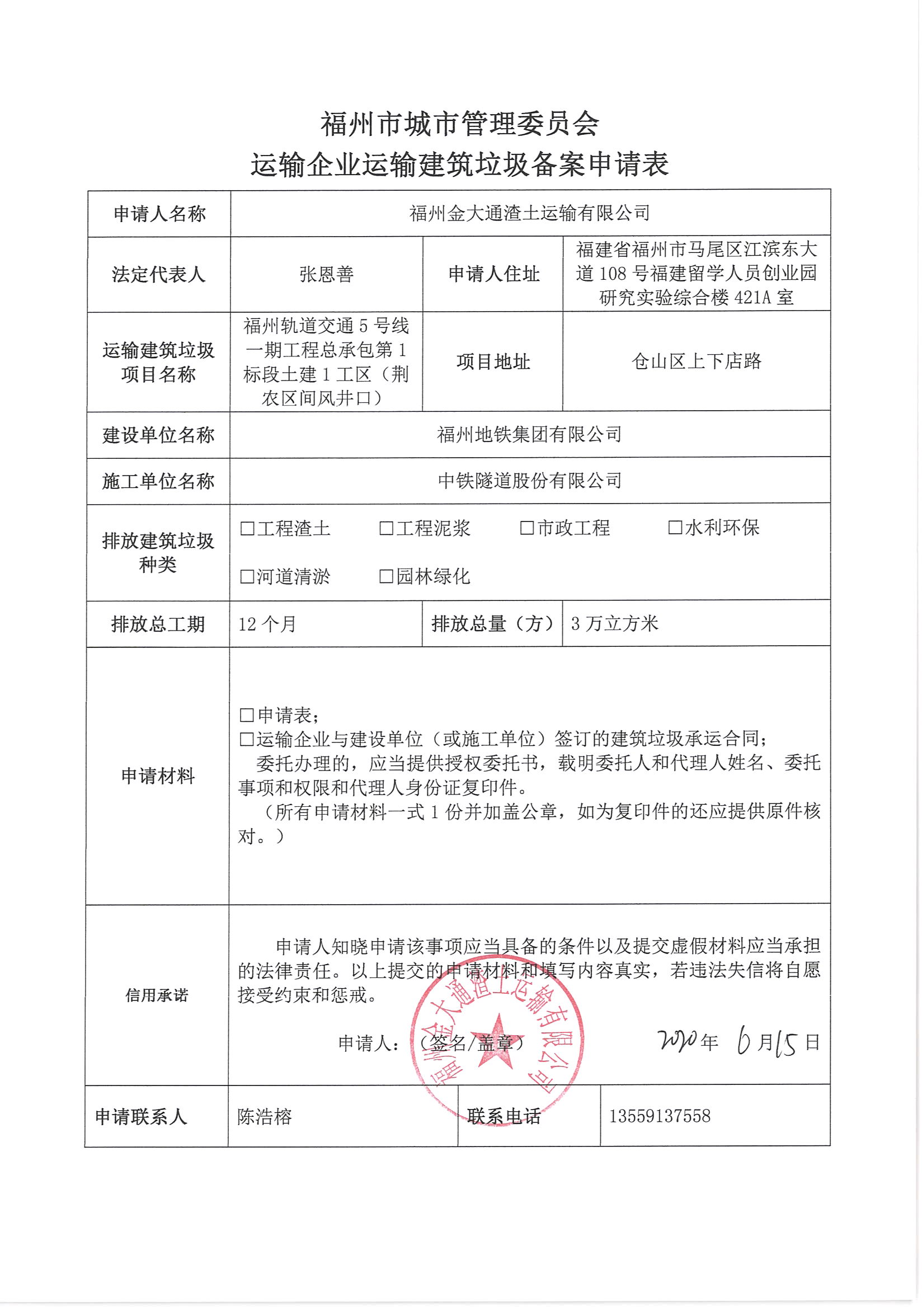 福州金大通渣土运输有限公司申请运输企业运输建筑垃圾备案1872号信用承诺