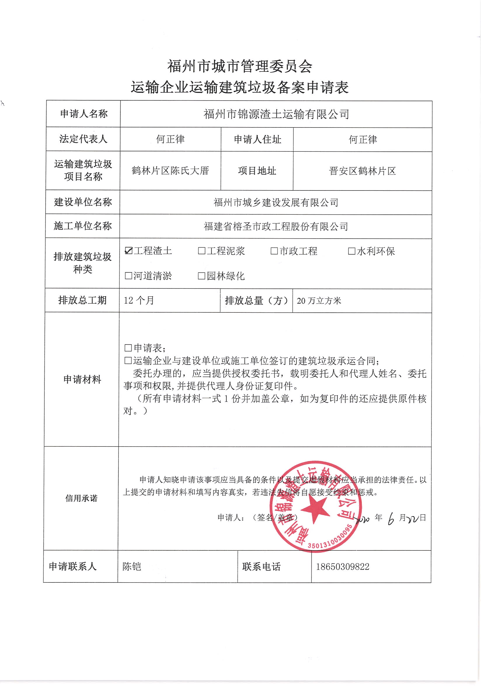 福州锦源渣土运输有限公司申请运输企业运输建筑垃圾备案1945号信用承诺