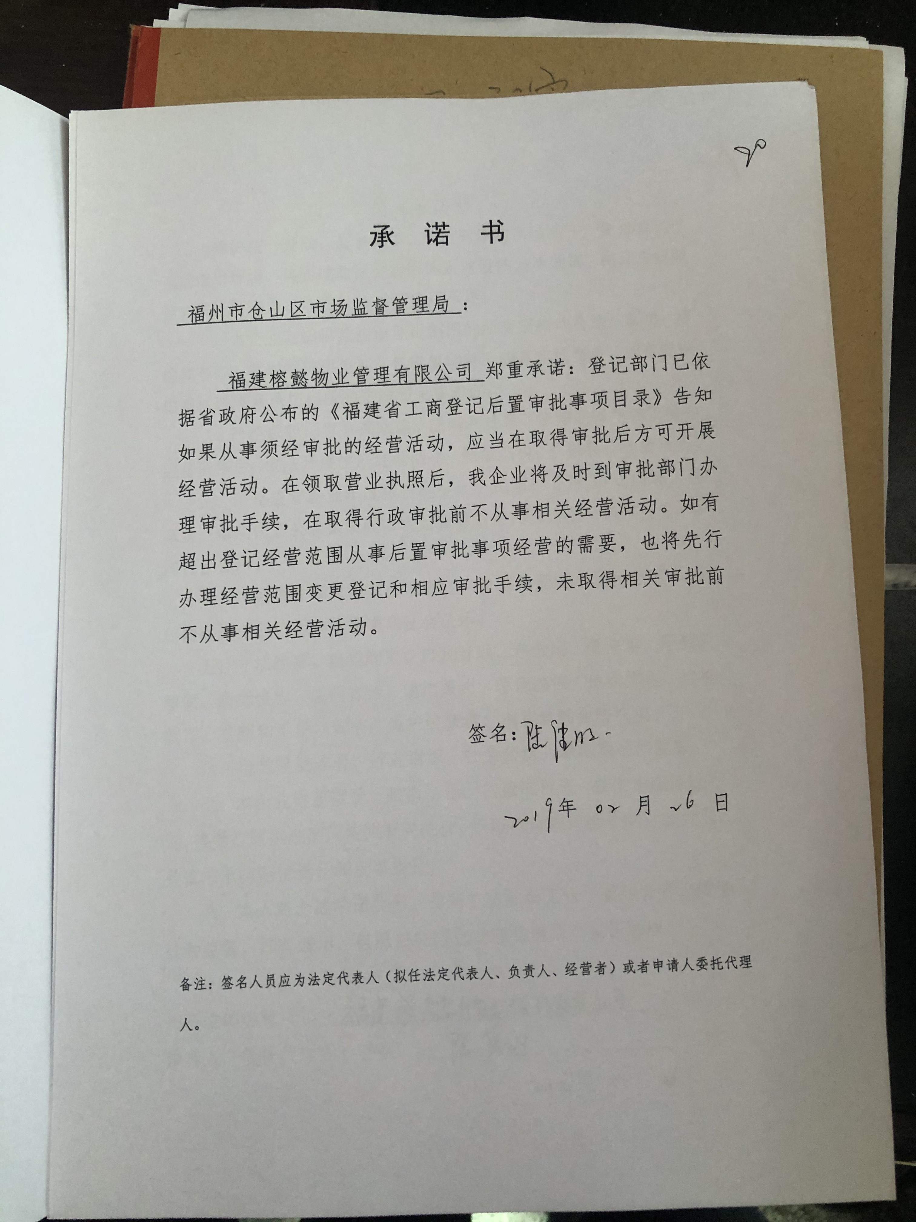 仓山区:福建榕懿物业管理有限公司承诺书