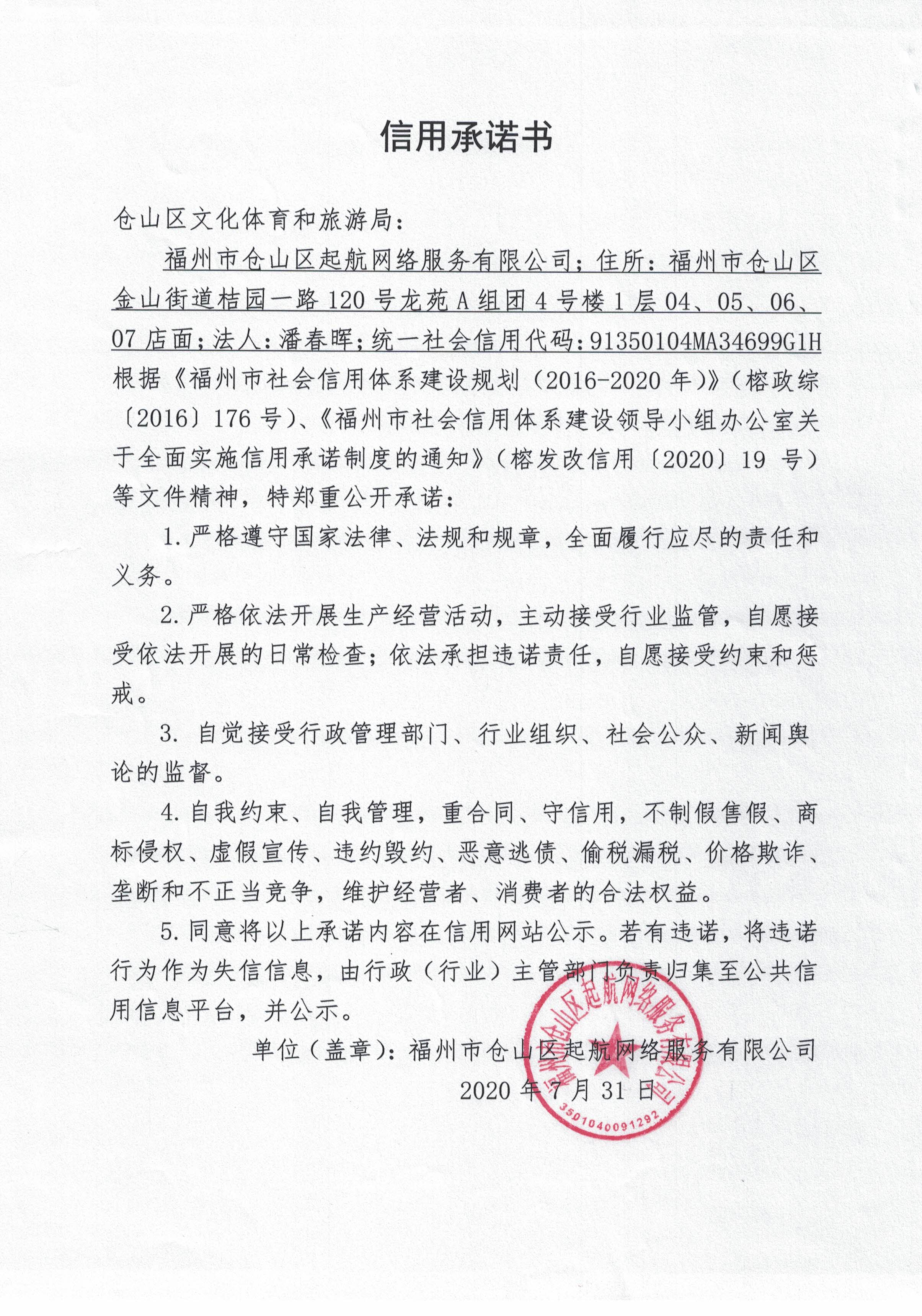 仓山区:福州市仓山区起航网络有限公司信用承诺书