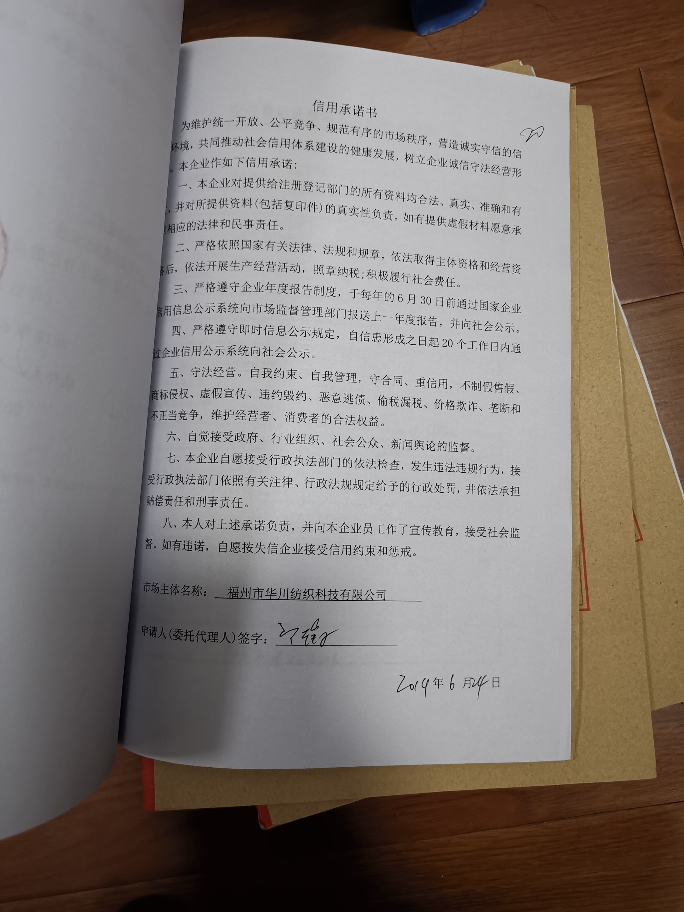 仓山区:福州华川纺织科技公司承诺书