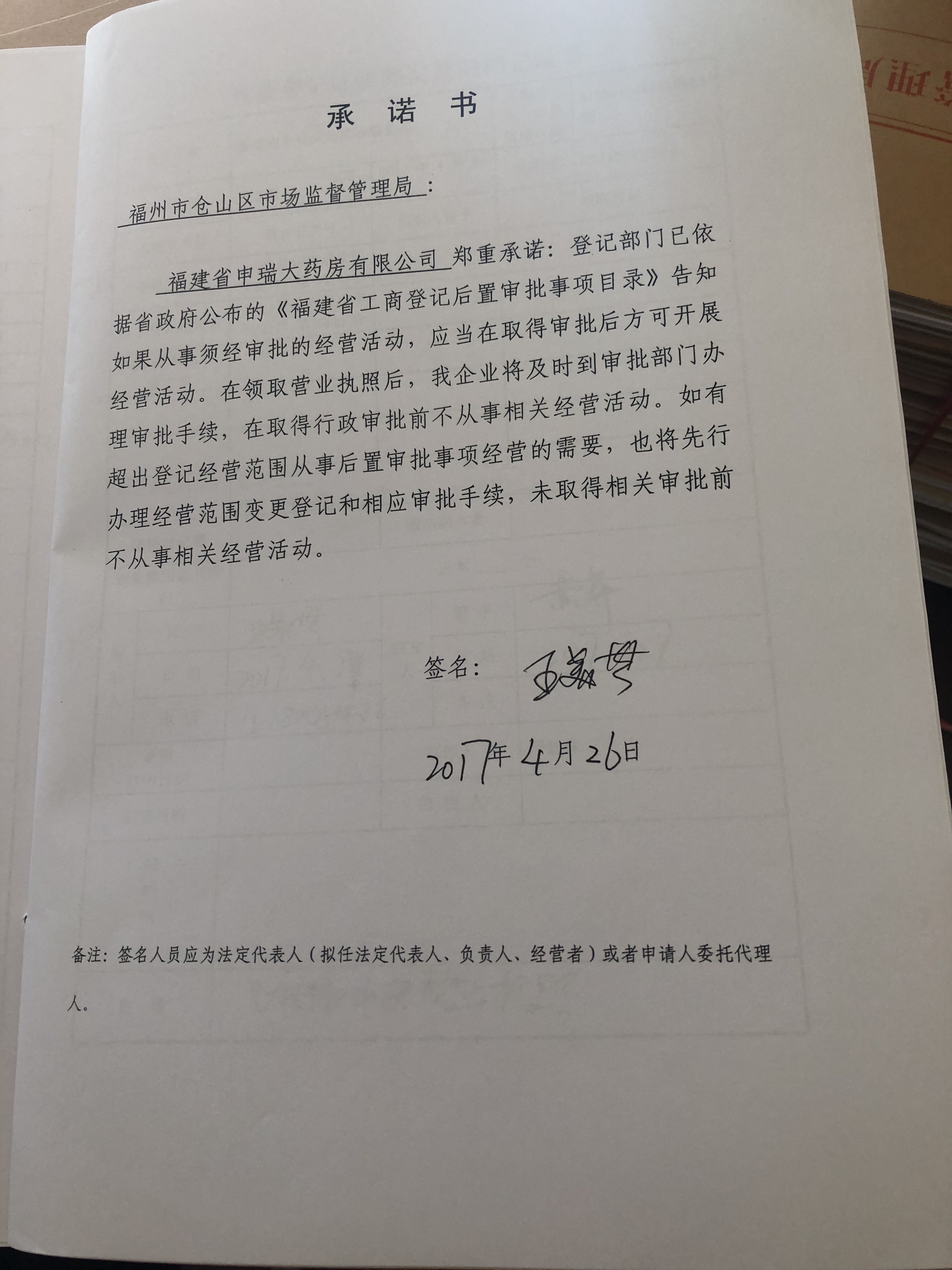 仓山区:福建省申瑞大药房有限公司信用承诺书2