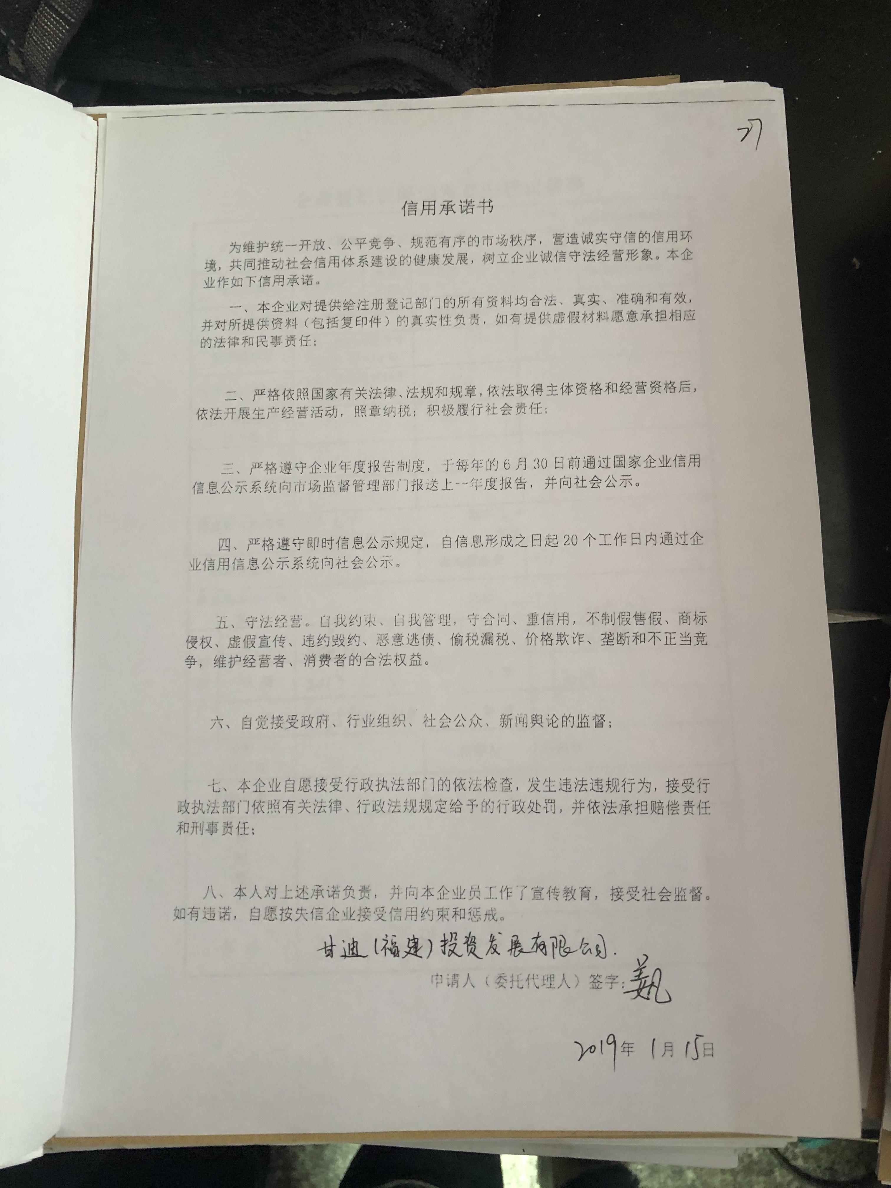 仓山区:甘迪(福建)投资发展有限公司信用承诺书1