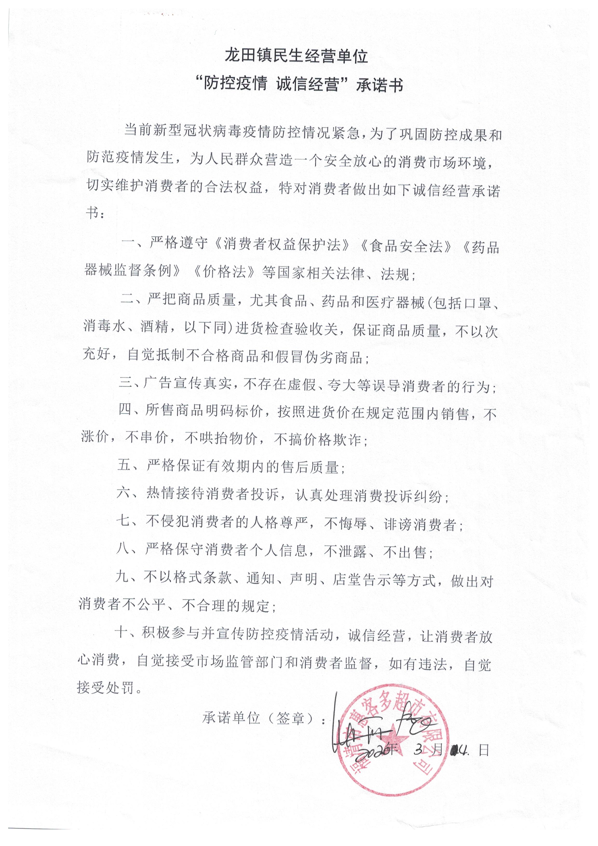 福清市惠客多超市有限公司信用承诺书