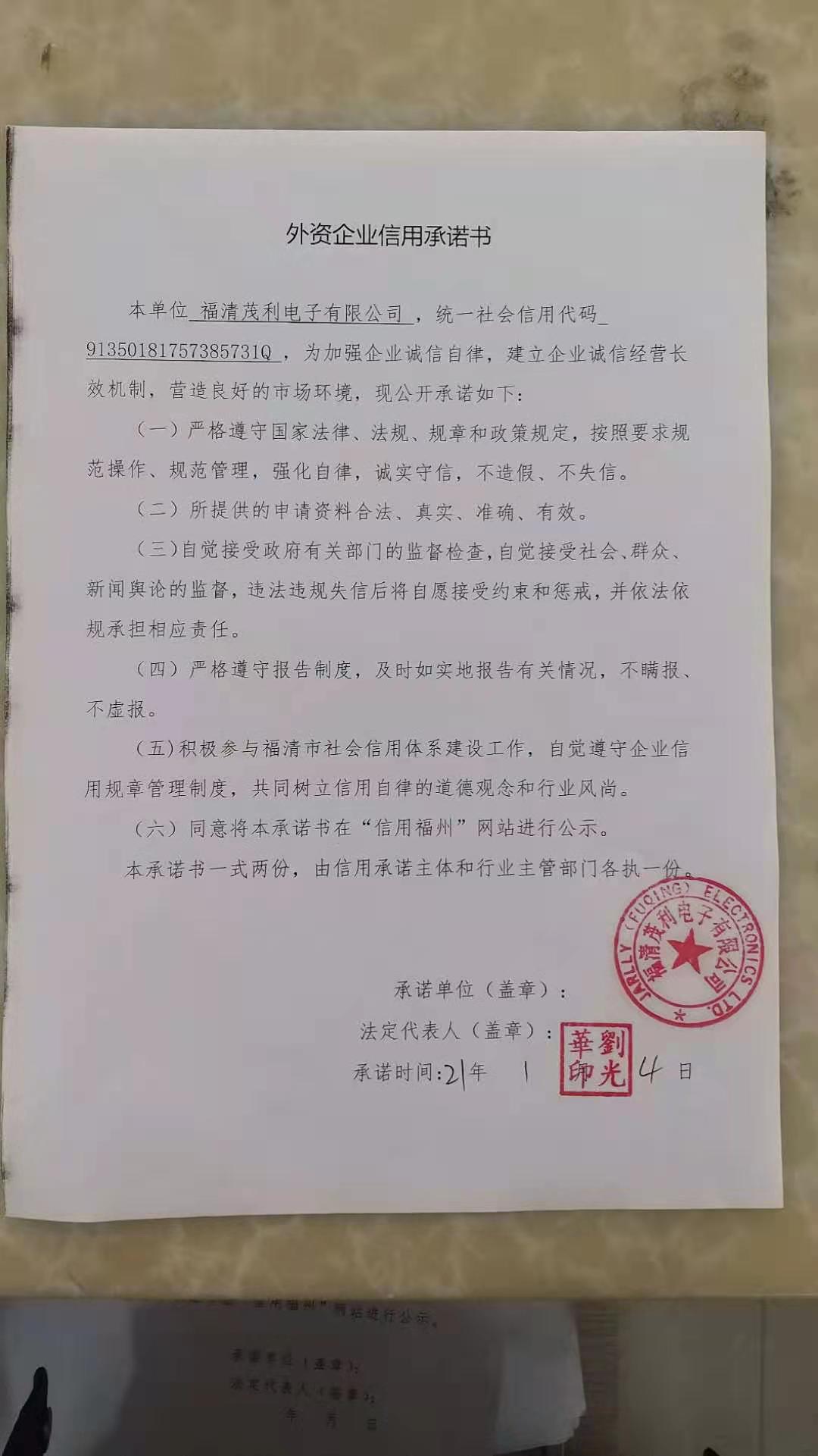 福清茂利电子有限公司企业信用承诺书
