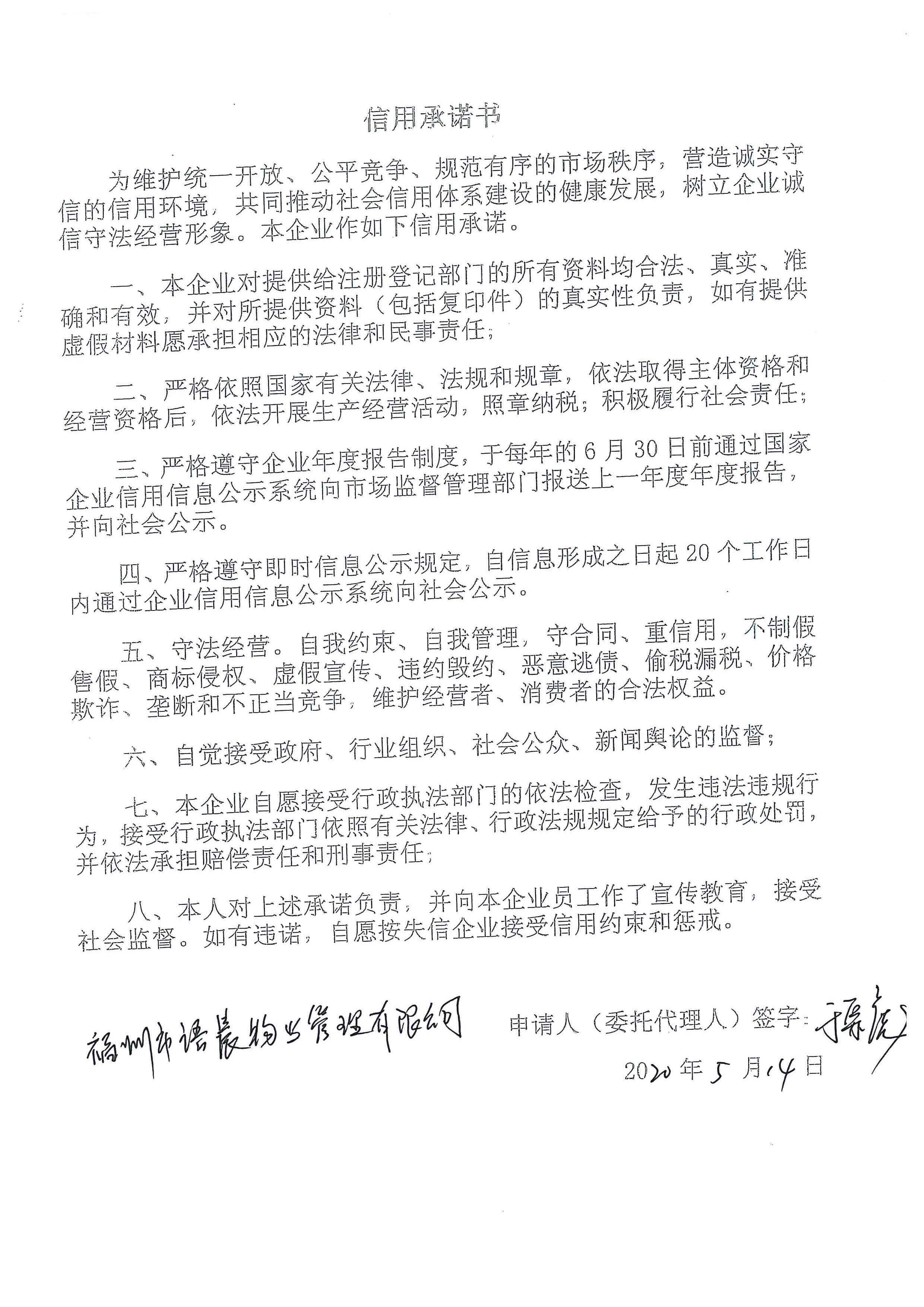 福州市语晨物业管理有限公司信用承诺书