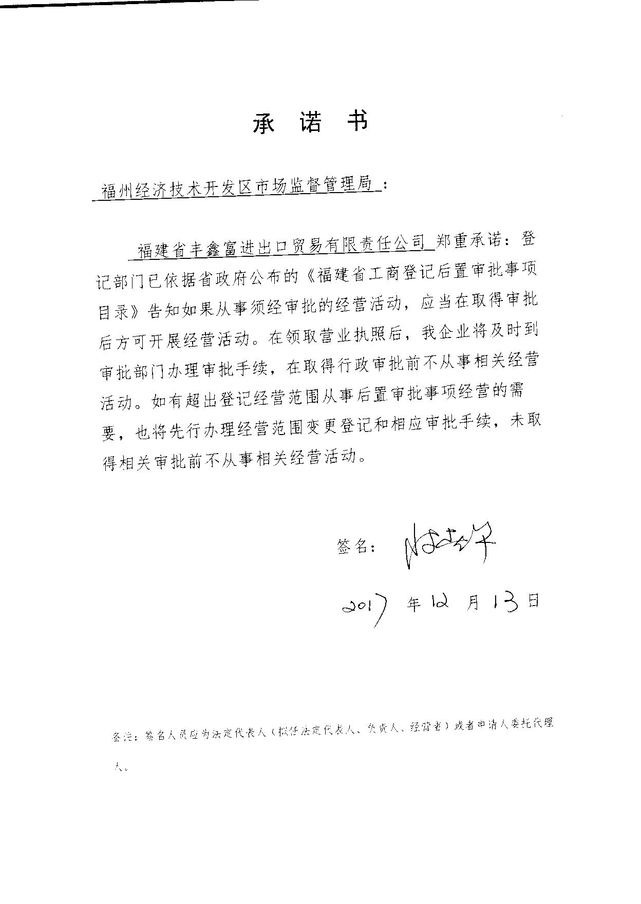 福建省丰鑫进出口贸易有限责任公司承诺书