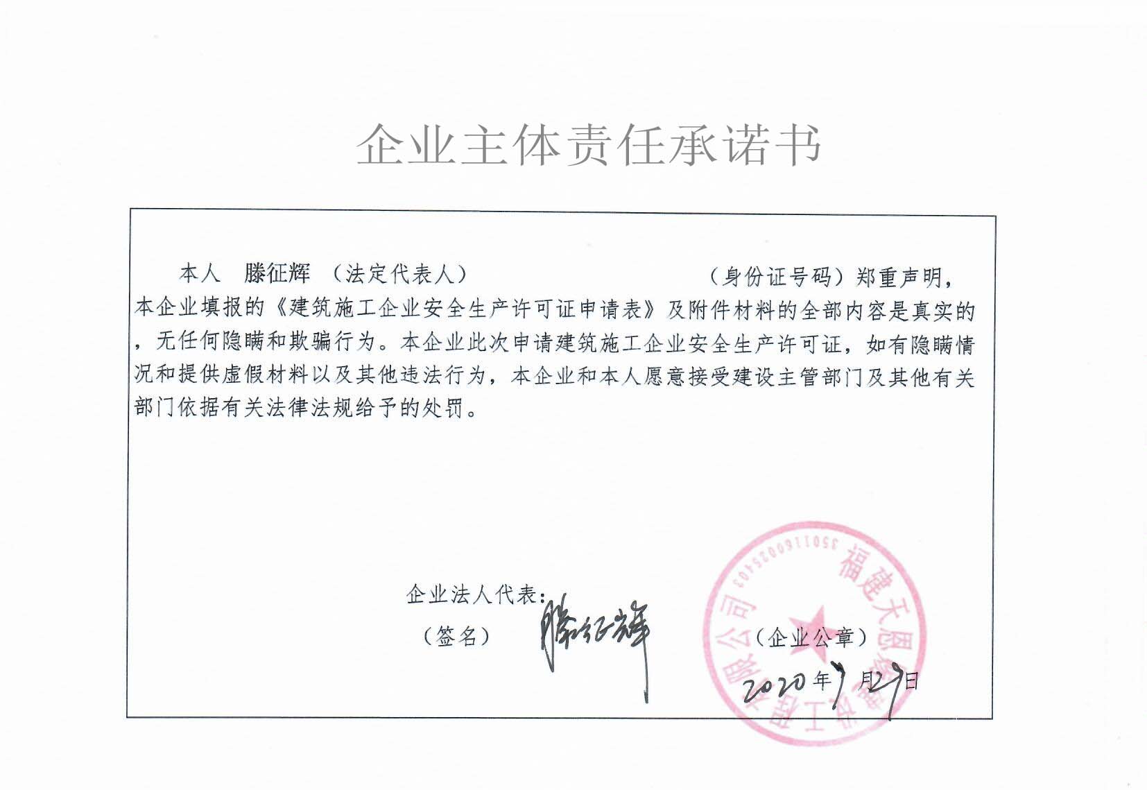 福建天恩赐建设工程有限公司安许诚信承诺书