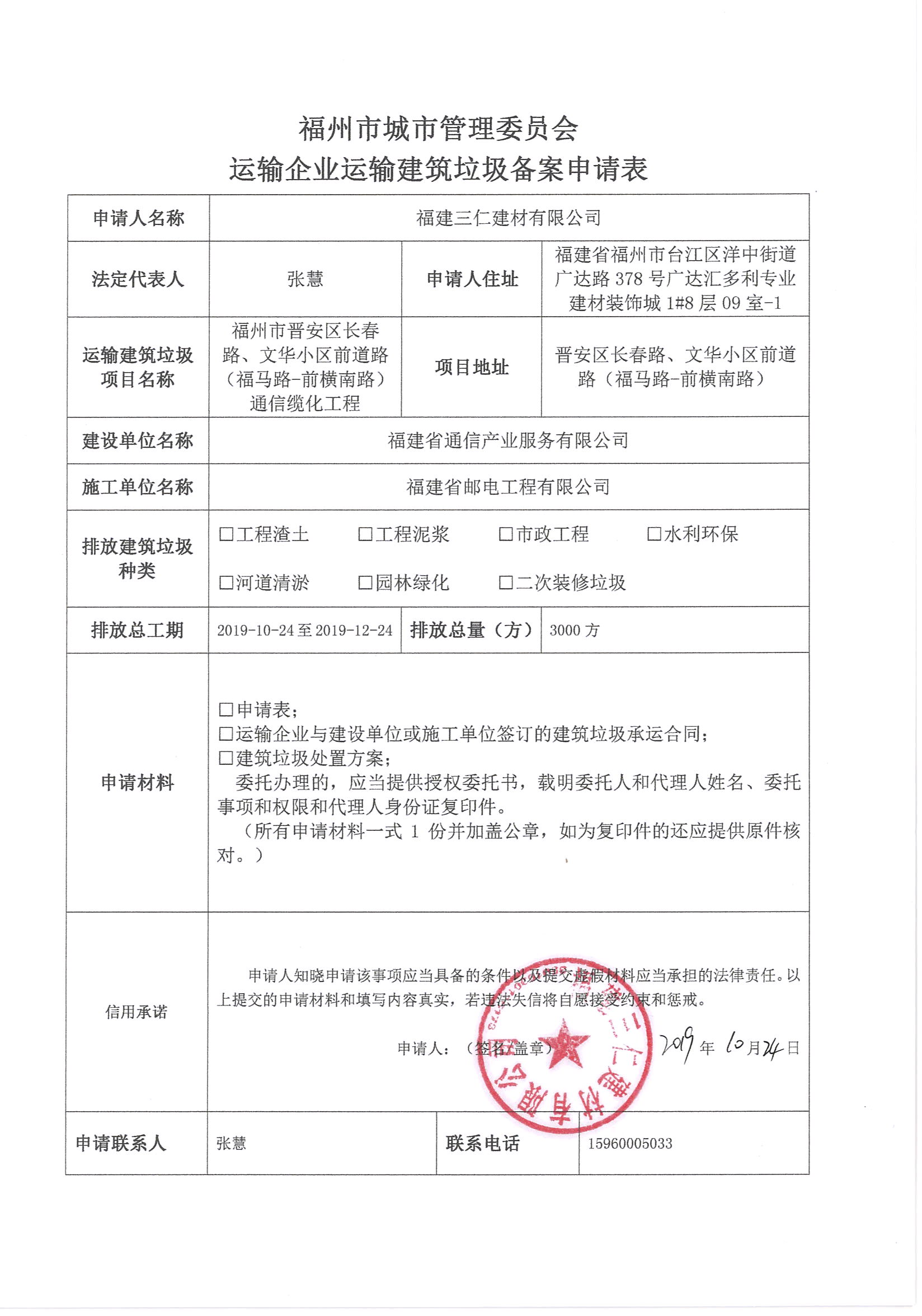 福建三仁建材有限公司申请运输企业运输建筑垃圾备案877号信用承诺