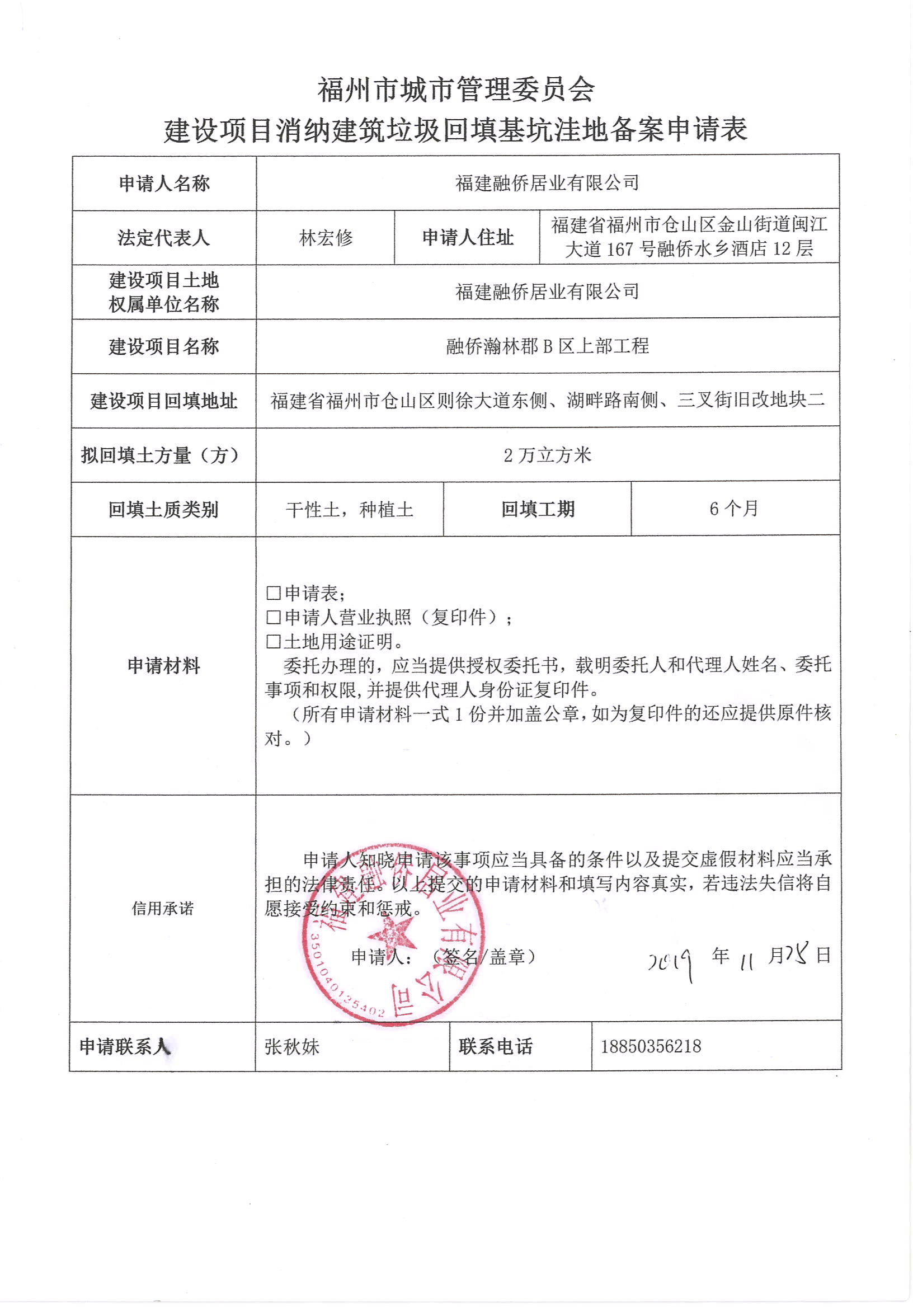 福建融侨居业有限公司申请建设项目消纳建筑垃圾回填基坑渣地备案494号信用承诺