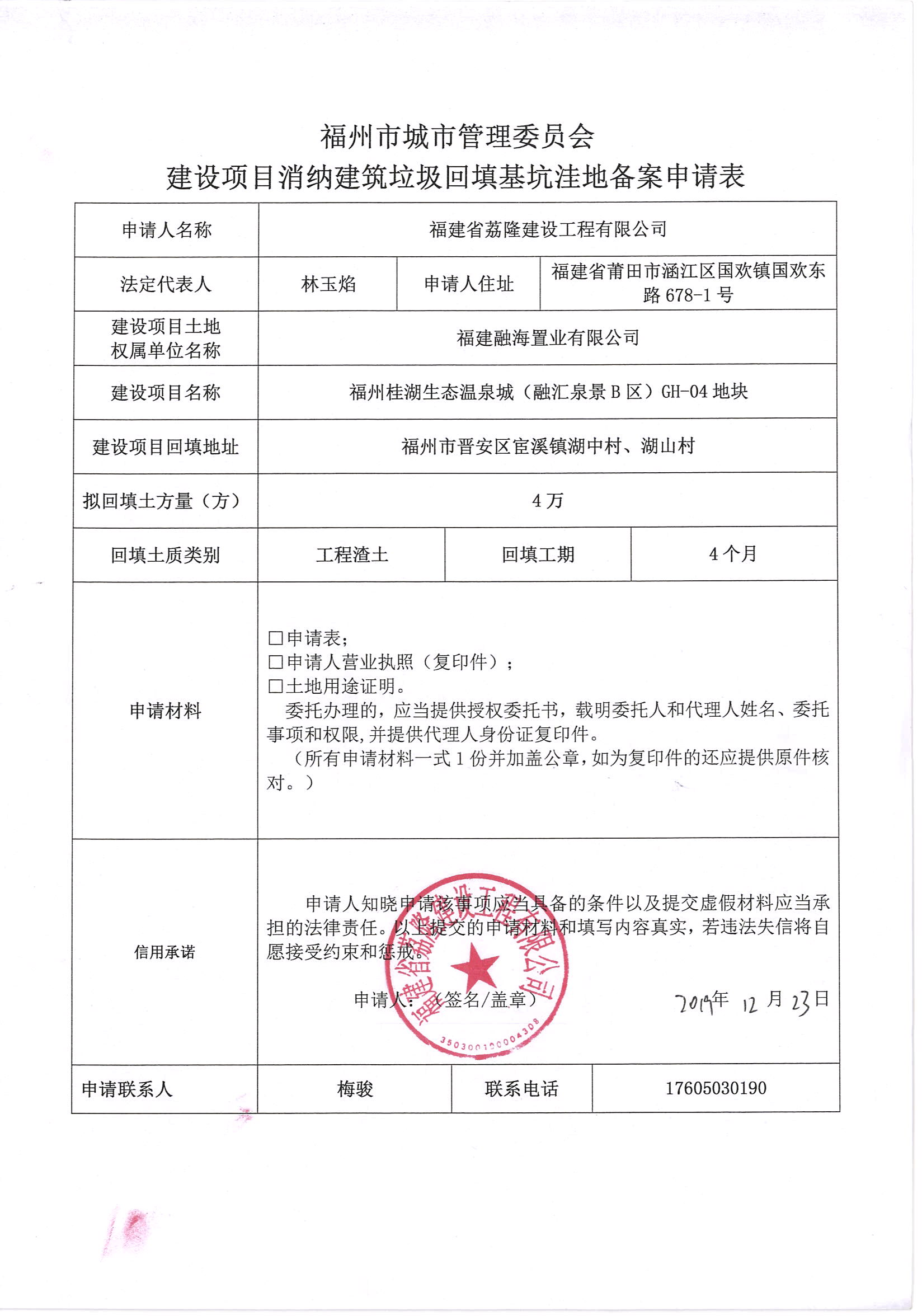 福建省荔隆建设工程有限公司申请建设项目消纳建筑垃圾回填基坑洼地备案557号信用承诺