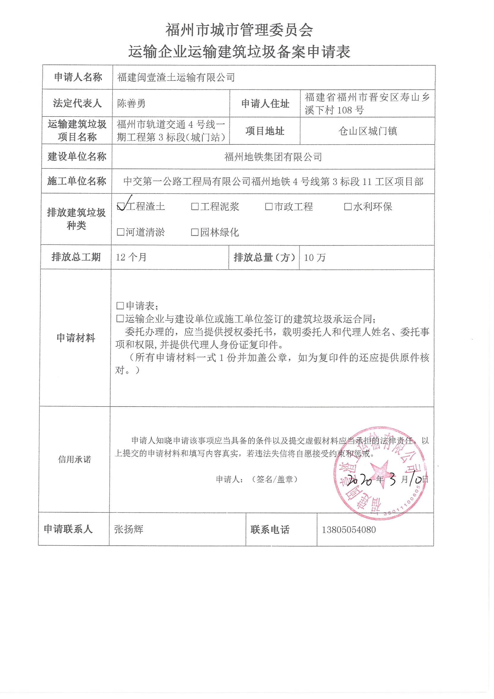 福建闽壹渣土运输有限公司申请运输企业运输建筑垃圾备案第370号信用承诺