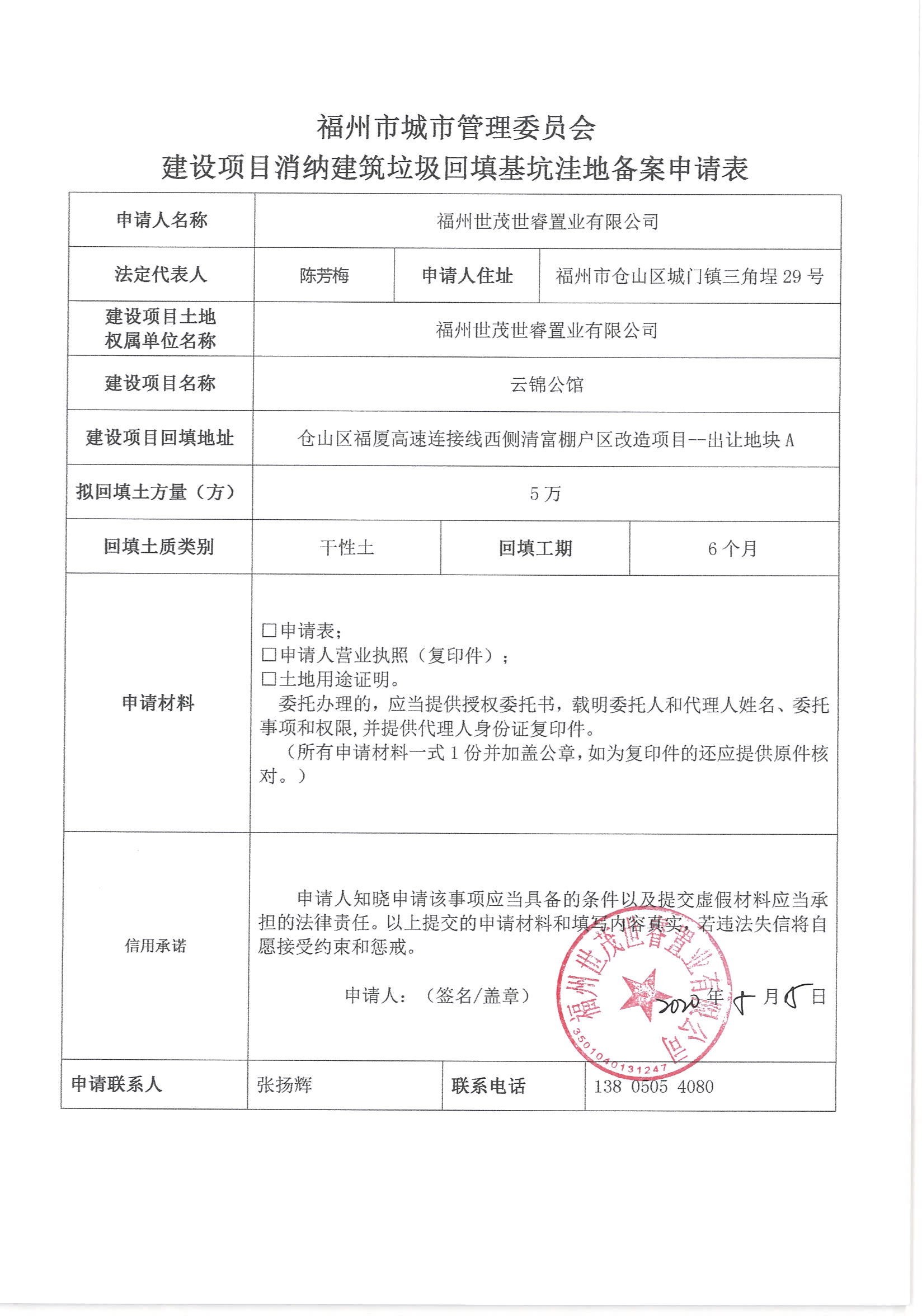 福州世茂世睿置业有限公司申请建设项目消纳建筑垃圾回填基坑洼地备案212号信用承诺
