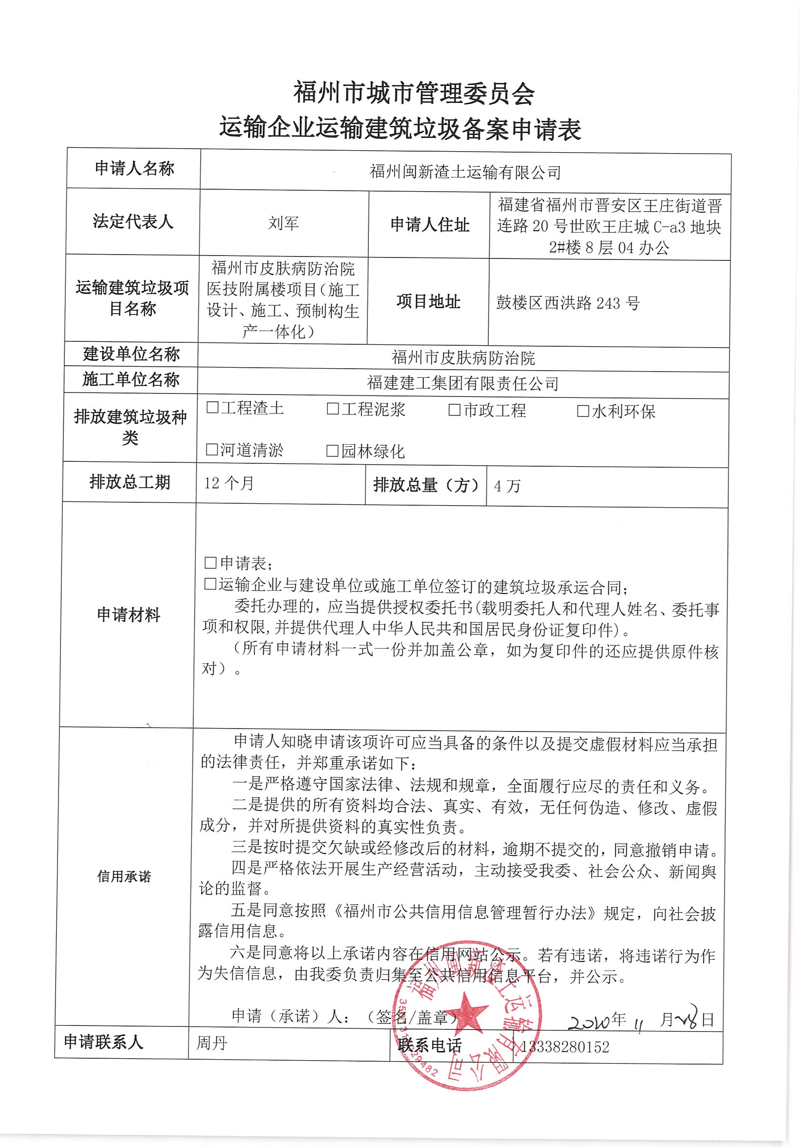 福州闽新渣土运输有限公司申请运输企业运输建筑垃圾备案3442号信用承诺