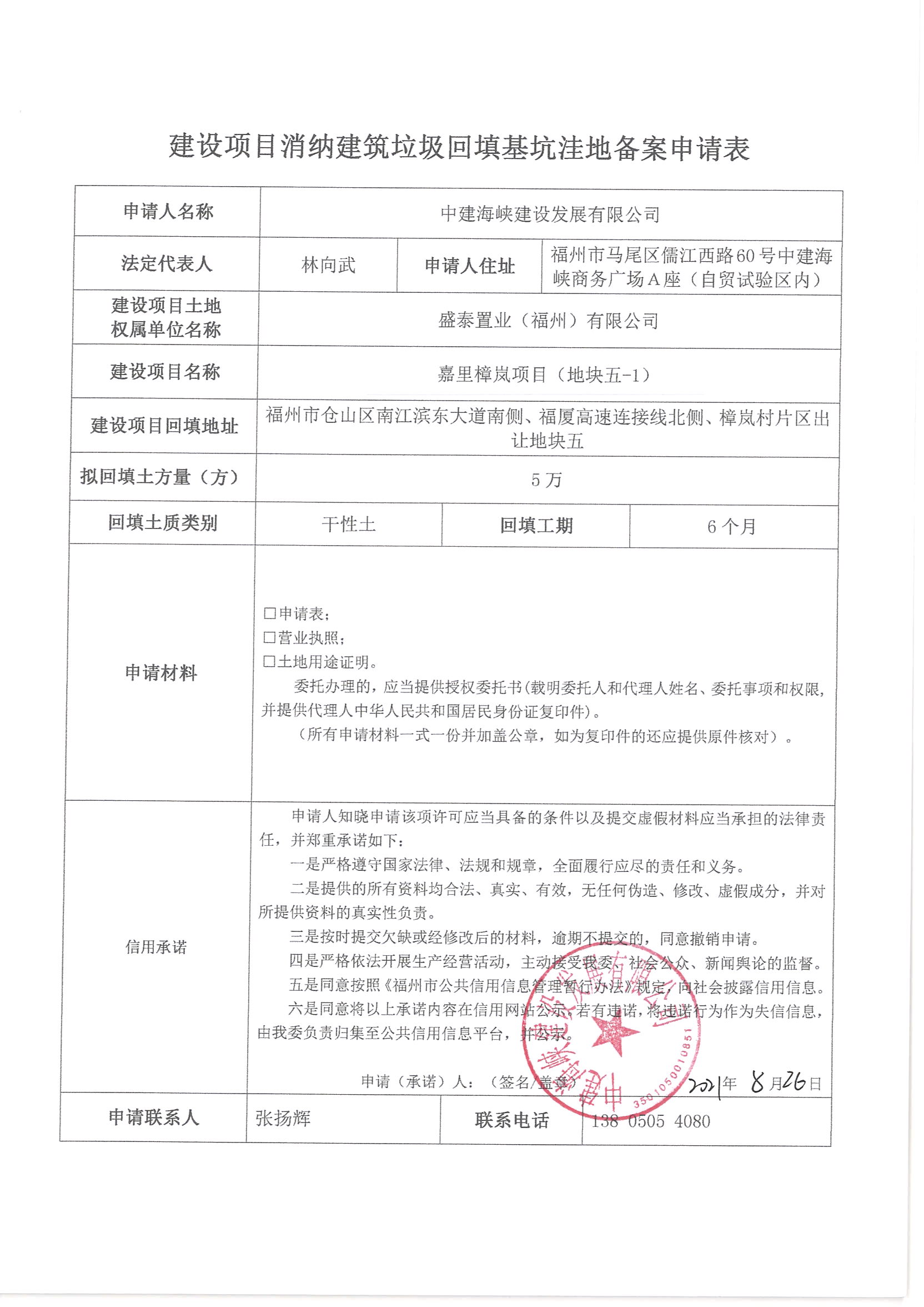 中建海峡建设发展有限公司申请建设项目消纳建筑垃圾回填基坑洼地备案385号信用承诺