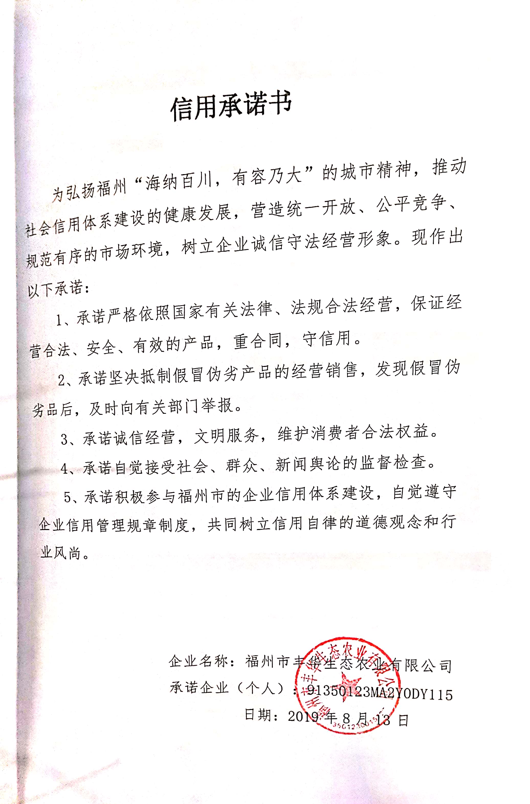 福州市丰华生态农业有限公司信用承诺书
