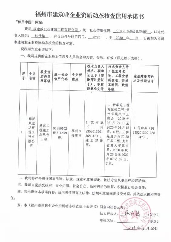 福建威世达建筑工程有限公司关于福州建筑业企业资质动态核查信用承诺书