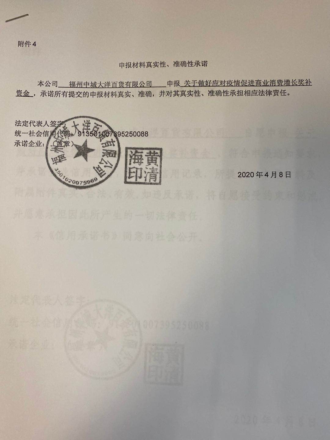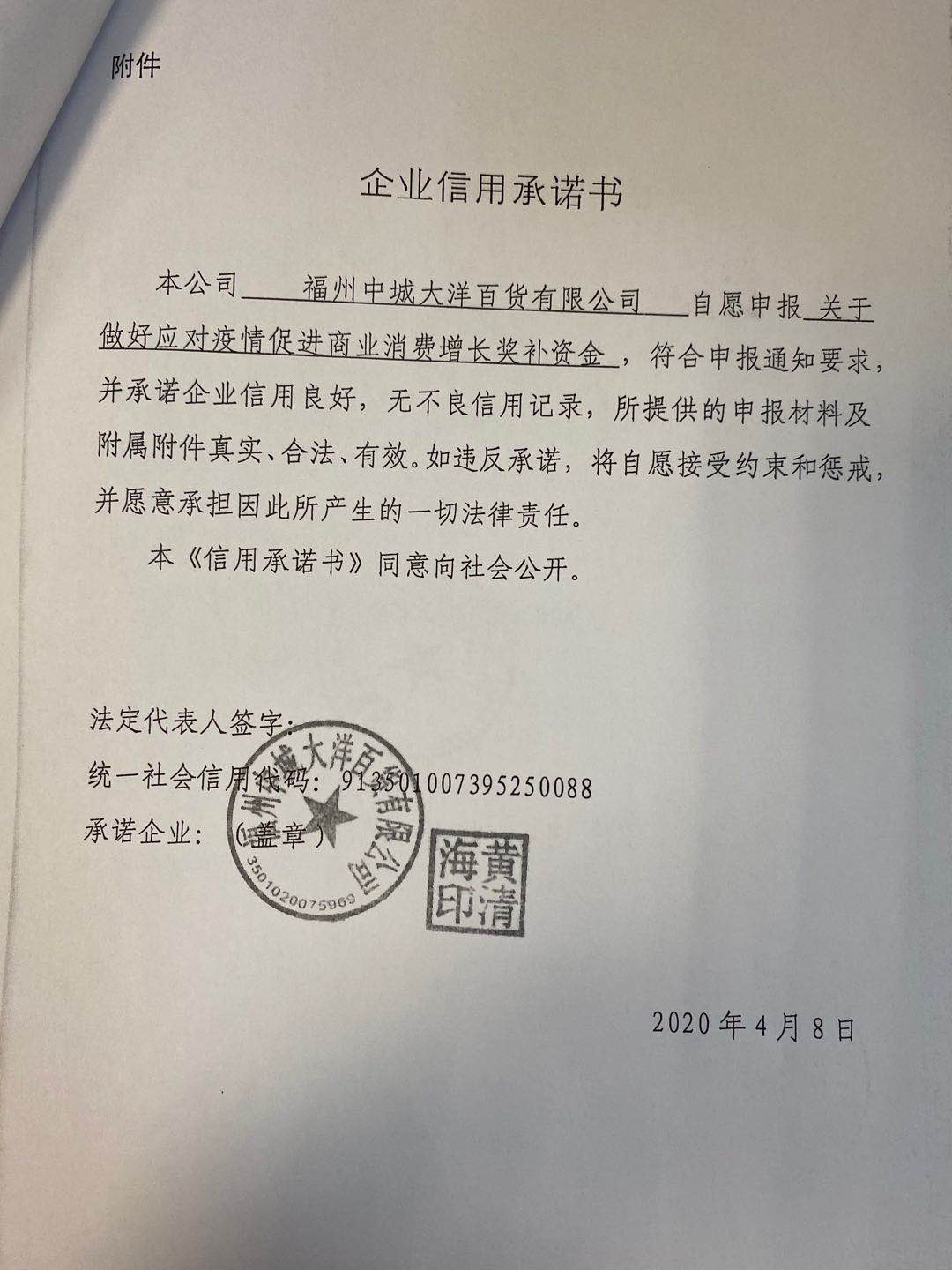 福州中城大洋百货有限公司承诺书
